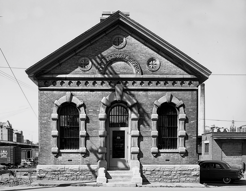Experienced architects know a strong foundation is key to lasting vision. The old Registry Office had 12-foot-deep foundations, not just for stability, but to stop thieves from tunneling in to steal land records. Outside, salmon-gold bricks rise from a stone foundation to create a classical temple-like structure. Decorative features such as round-headed windows, arched doorways with rusticated quoins, and an elaborate shared chimney highlight the practical beauty of the Beaux-Arts. A curved name stone crowns the front façade, resting on a wide ledge with small flower-shaped vents, while a stepped cornice, metal trim, and turned-back roof edges enhance its timeless charm. Inside, three vaulted brick ceilings define the space. Solid iron doors, window bars, and shutters protected documents from fire, while heavy ledgers sat on rolling cases set in iron floor tracks.